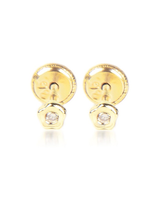 Cercei din aur galben 9K pentru nou nascuti, bebelusi, copii, in forma de floricele mici cu pietricica zirconia. Sunt prevazuti cu sistem special de inchidere, cu un capacel rotunjit care se insurubeaza pe tija, protejand pielea de sub ureche si prevenind pierderea.